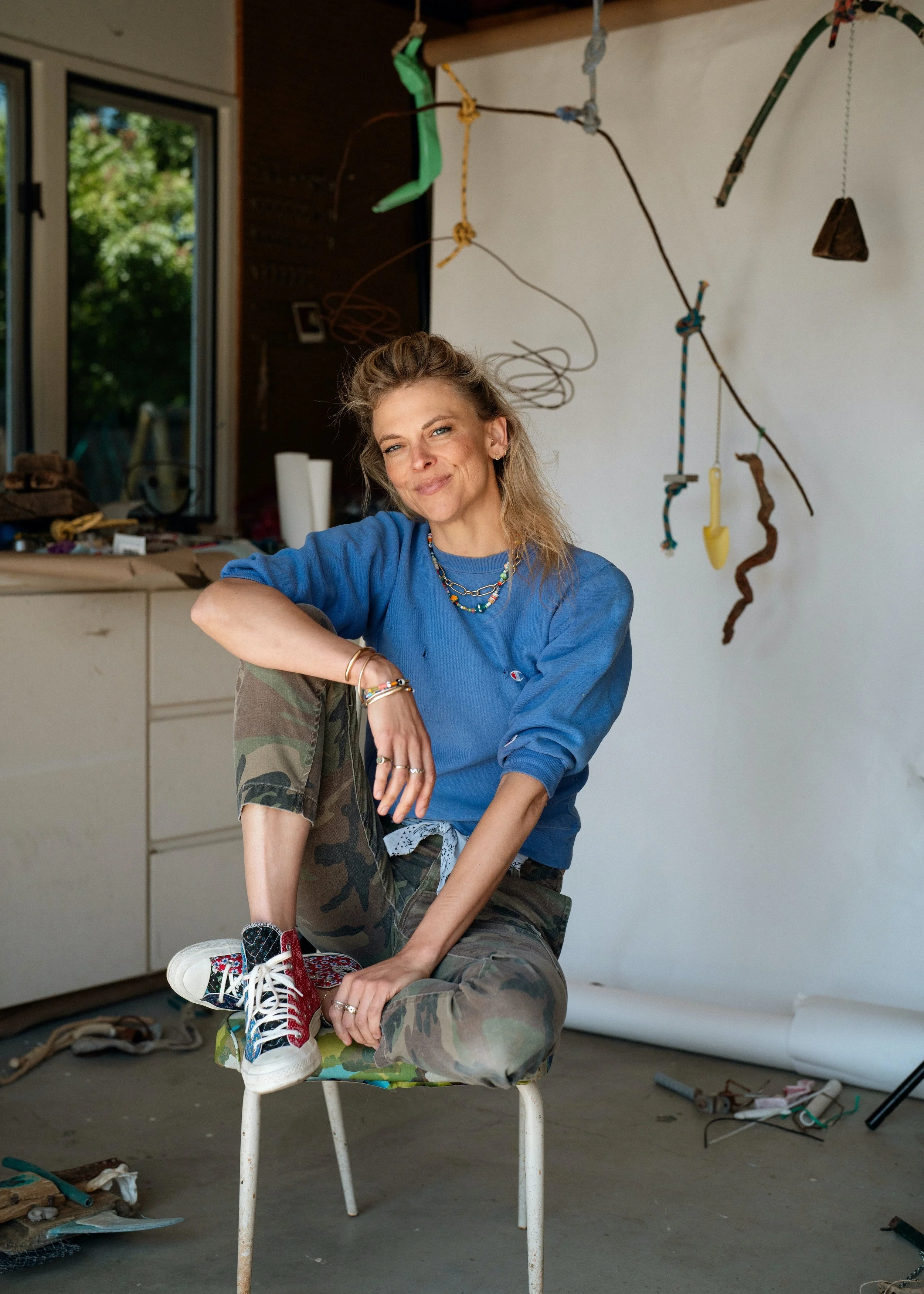 Next came a return to fine art, with a gallery show in spring 2024 at Helena Mason Gallery in Santa Barbara featuring her found object wall hangings, "mobiles," and sculptures. These pieces continue on her earth conscious ethos, composed entirely of items she has collected from beaches, trails, and city streets, at once removing trash from our planet, and reframing them as beauty and moments in time.